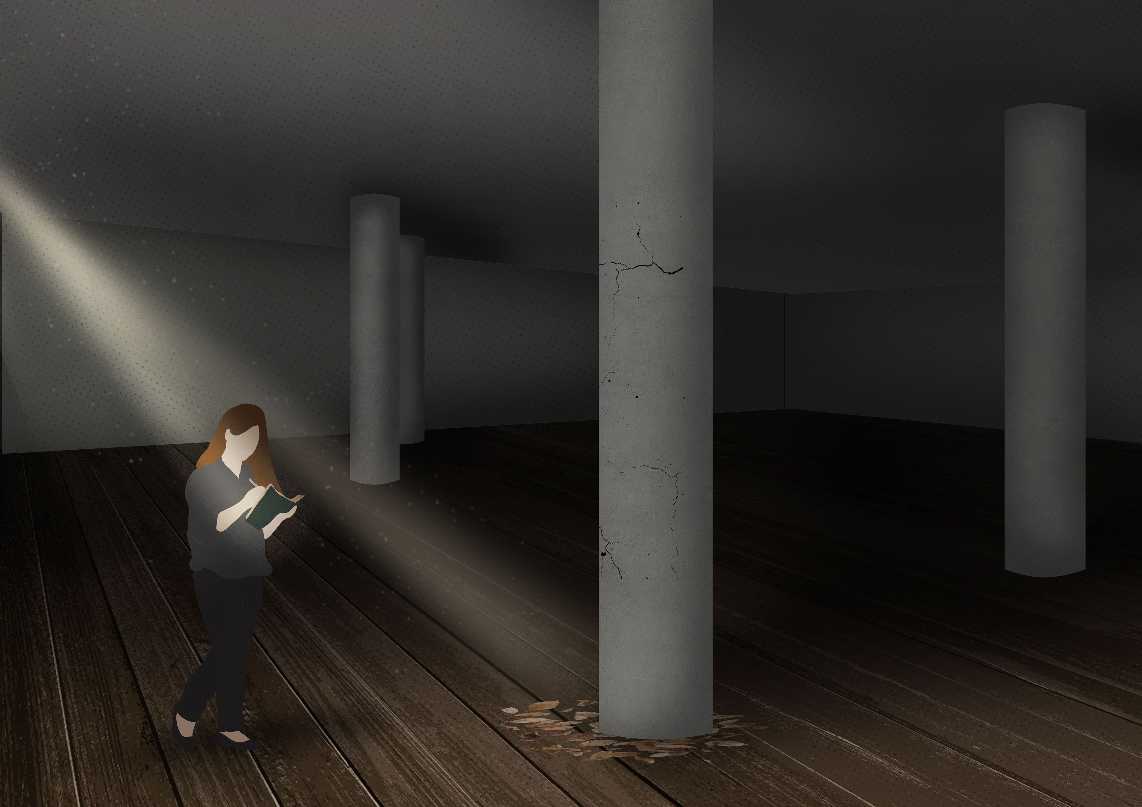 Then... it begins with the jingle of keys. A door creaks. Dust bunnies dance through the air. Light creeps in. Someone new. She walks confidently through my space, running her hands along my walls, stopping to admire a column and the height of the ceiling. ”How about we let some natural light in?” she says as she starts sketching “...so vast...so many possibilities”.
